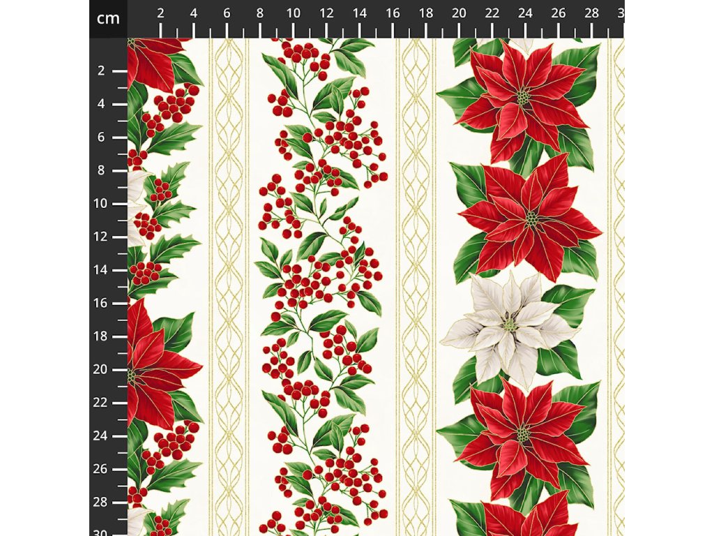 Látka s tiském v pruzích. Skvělá na kaleidoskopy nebo bordury/rámečky. Nádhera. Na šíři látky ( 110cm) je pět pruhů nad sebou- tři stejné pruhy a dva stejné pruhy, které se střídají. Výška pruhů mezi metalickými bordurkami (vlnkami) je 10cm. Opakování vedle sebe pak u tří stejných pruhů po cca 20cm, u dvou stejných pruhů cca 20cm. Pokud rozřežete na pruhy, budete mít tedy 5 průhů s potiskem vánočních růží, 5 pruhů s cesmínou a 8 pruhů s vlnkovou bordurkou. S látkou si tak můžete krásně hrát a lze ji použít mnoha způsoby.