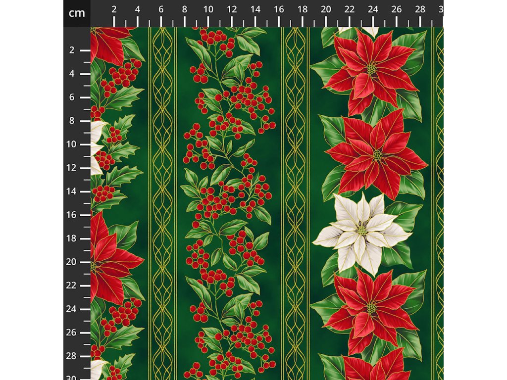 Látka s tiském v pruzích. Skvělá na kaleidoskopy nebo bordury/rámečky. Nádhera. Na šíři látky ( 110cm) je pět pruhů nad sebou- tři stejné pruhy a dva stejné pruhy, které se střídají. Výška pruhů mezi metalickými bordurkami (vlnkami) je 10cm. Opakování vedle sebe pak u tří stejných pruhů po cca 20cm, u dvou stejných pruhů cca 20cm. Pokud rozřežete na pruhy, budete mít tedy 5 průhů s potiskem vánočních růží, 5 pruhů s cesmínou a 8 pruhů s vlnkovou bordurkou. S látkou si tak můžete krásně hrát a lze ji použít mnoha způsoby.