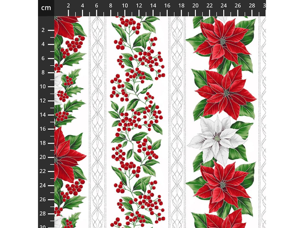 Látka s tiském v pruzích. Skvělá na kaleidoskopy nebo bordury/rámečky. Nádhera. Na šíři látky ( 110cm) je pět pruhů nad sebou- tři stejné pruhy a dva stejné pruhy, které se střídají. Výška pruhů mezi metalickými bordurkami (vlnkami) je 10cm. Opakování vedle sebe pak u tří stejných pruhů po cca 20cm, u dvou stejných pruhů cca 20cm. Pokud rozřežete na pruhy, budete mít tedy 5 průhů s potiskem vánočních růží, 5 pruhů s cesmínou a 8 pruhů s vlnkovou bordurkou. S látkou si tak můžete krásně hrát a lze ji použít mnoha způsoby.