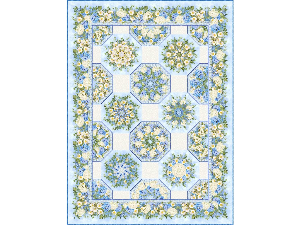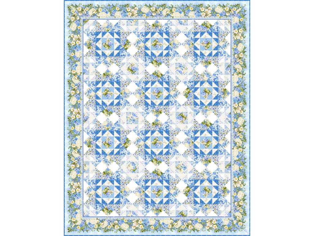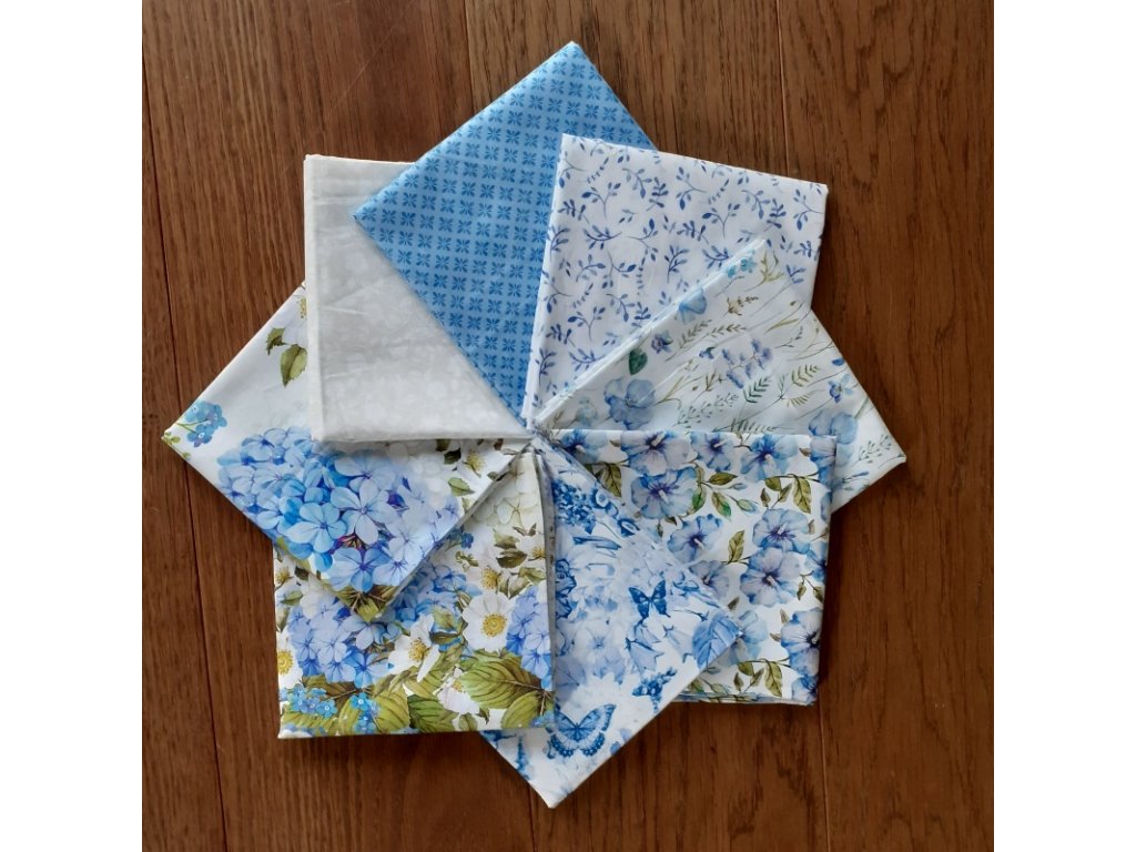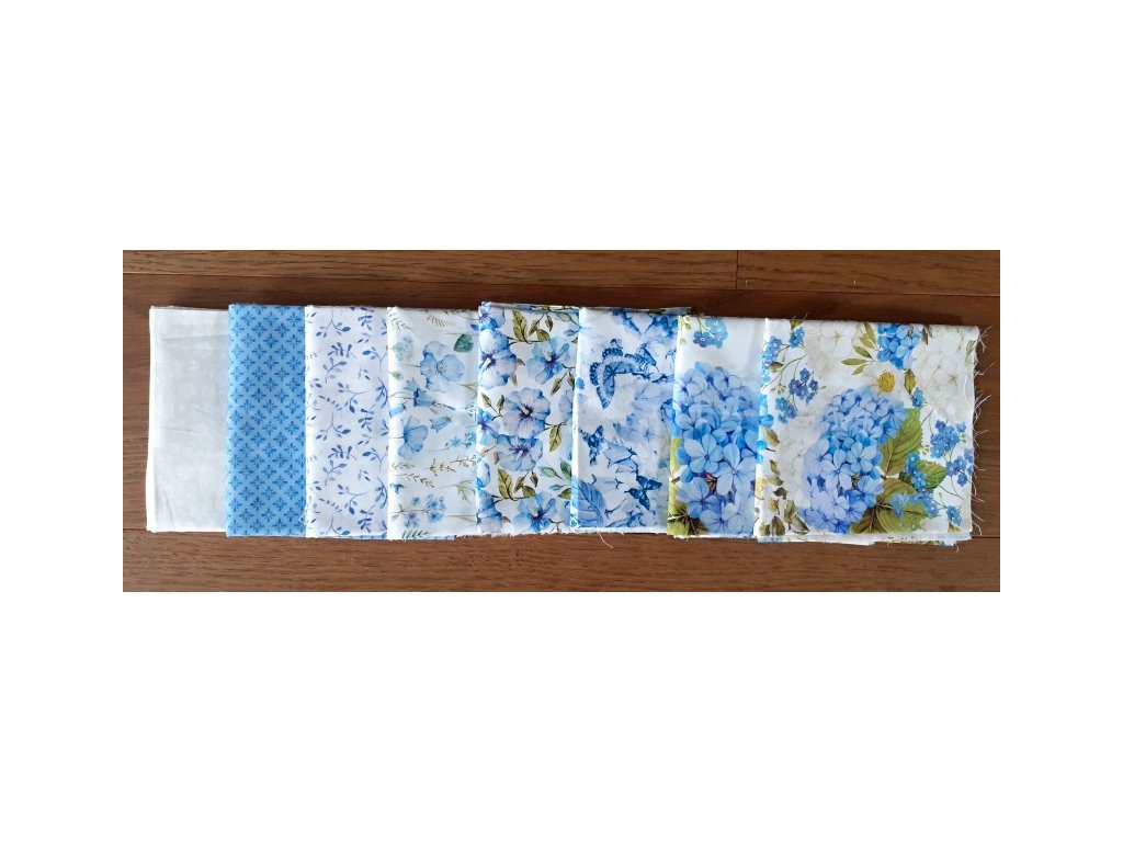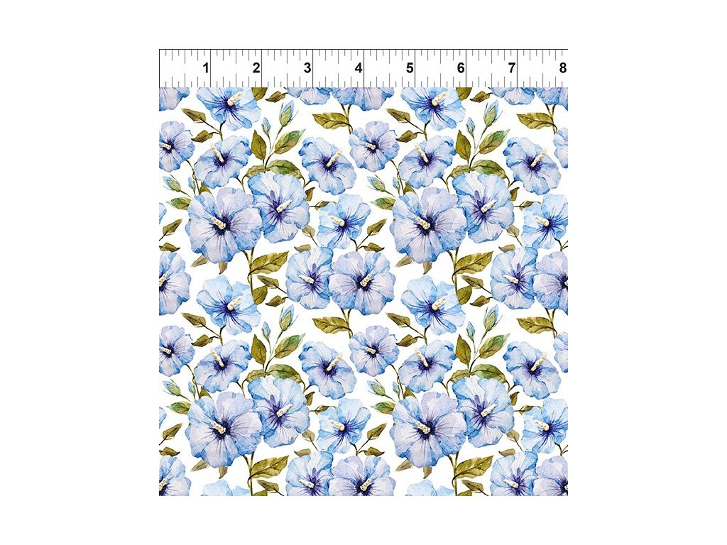 Krásná pomněnkově-modrá kolekce plná hortenzií, růží, lesních pomněnek... Na této látce je drobnější celoplošný potisk, velikost květů cca 3 cm. Měřítko na originálním obrázku v palcích. 100% bavlněná látka jemného krásného digitálního tisku. Gramáž 139g na m2.