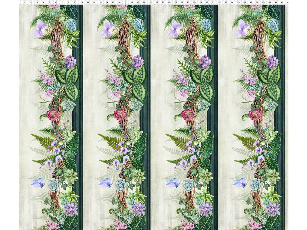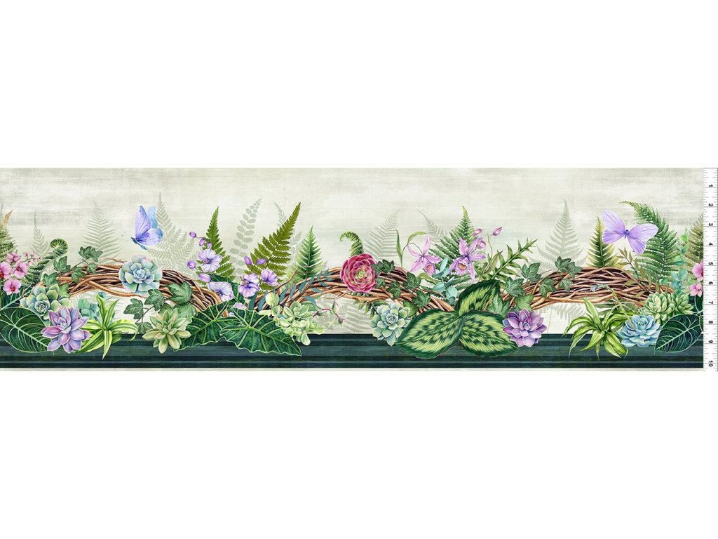 Příjemná bordura do zelených tónů. Najdete na ní i sukulenty :) Měřítko na obrázku v palcích. Čtyři opakování v šíři 112 cm nad sebou. Koupíte délku deky a máte na všechny čtyři strany nádhernou borduru. Výborné také pro kaleidoskopy...100% bavlněná látka jemného krásného digitálního tisku. Gramáž 139g na m2.