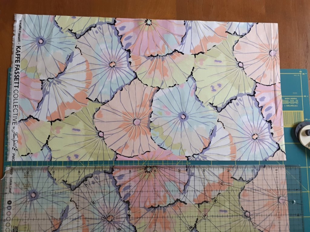 Z látek Kaffe Fassett Lotus Leaf budete potřebovat zakoupit 1,3 m. Opakování vzoru je cca po 30 cm nad sebou, vedle sebe je vzor tištěn 2x. Rezervu pro vaše řezání 10 cm.