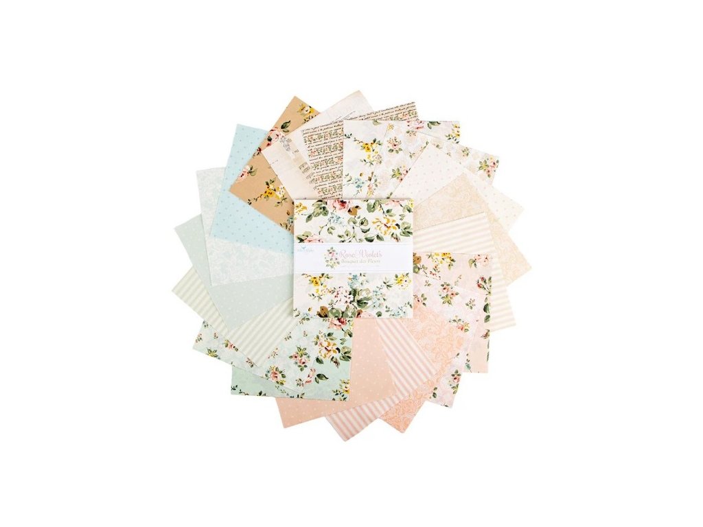 Krásná romantická kolekce od Rose Sister Violet. Dovezli jsme pro vás neobvyklou úplnou kolekci růží, růžiček, puntíčků, proužků, krajek,...A velký poklad- len s tisky těchto růží. Měřítko na obrázku je v palcích.