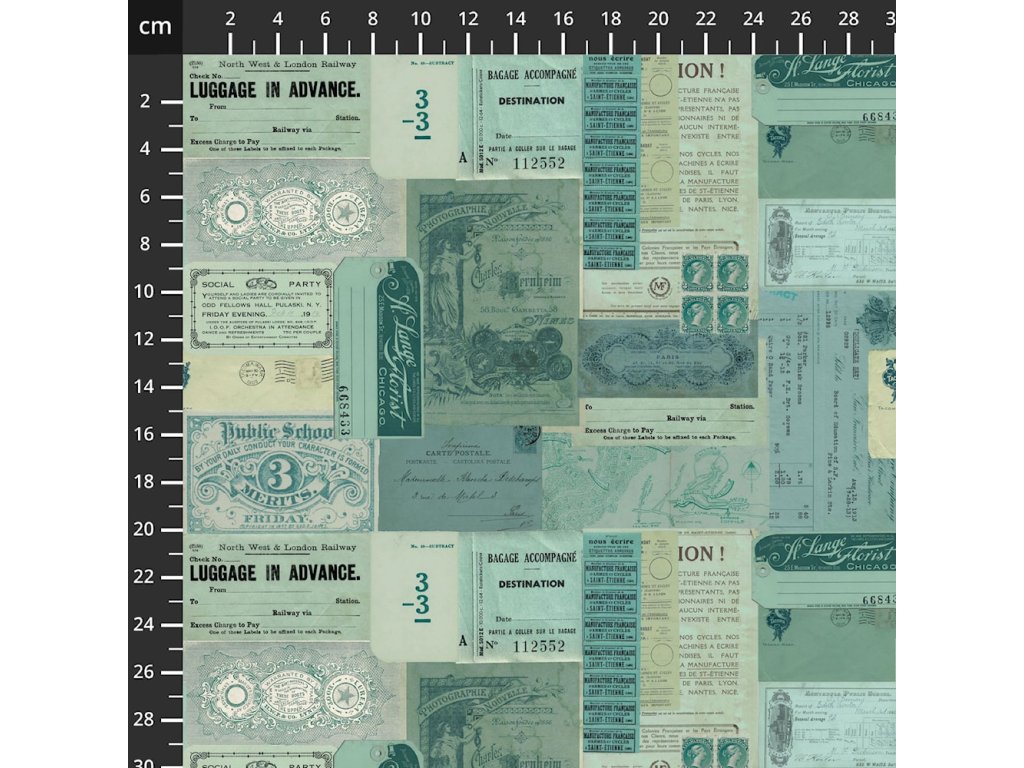 Šíře 112cm. Gramáž 135g na m2, 100% bavlna, plátnová vazba, scan a digitální tisk. Na obrázku měřítko v palcích.
