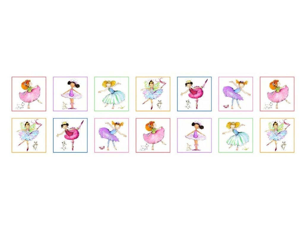 Velikost panelu je 112x 30 cm. Dvě řady obrázků, celkem14 obrázků o velikosti 12,5x12,5cm. Pozadí bílé. Pokud zakoupíte více panelů, uřízneme v celku. Bylo by moc hezké také na polštář nebo peřinu, tak abychom baletky nerozřízli...