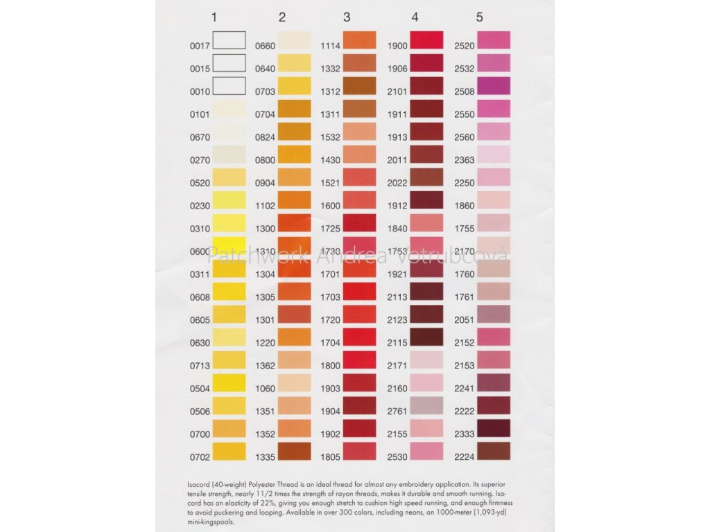 ISACORD 40 (odpovídá zhruba čm 75/2), návin na miniking-cívkách v délce 1000 m. Můžeme objednat i návin 5000m. Pokud používáte na vyšívání nebo overlokové šití, ubývají nitě před očima.