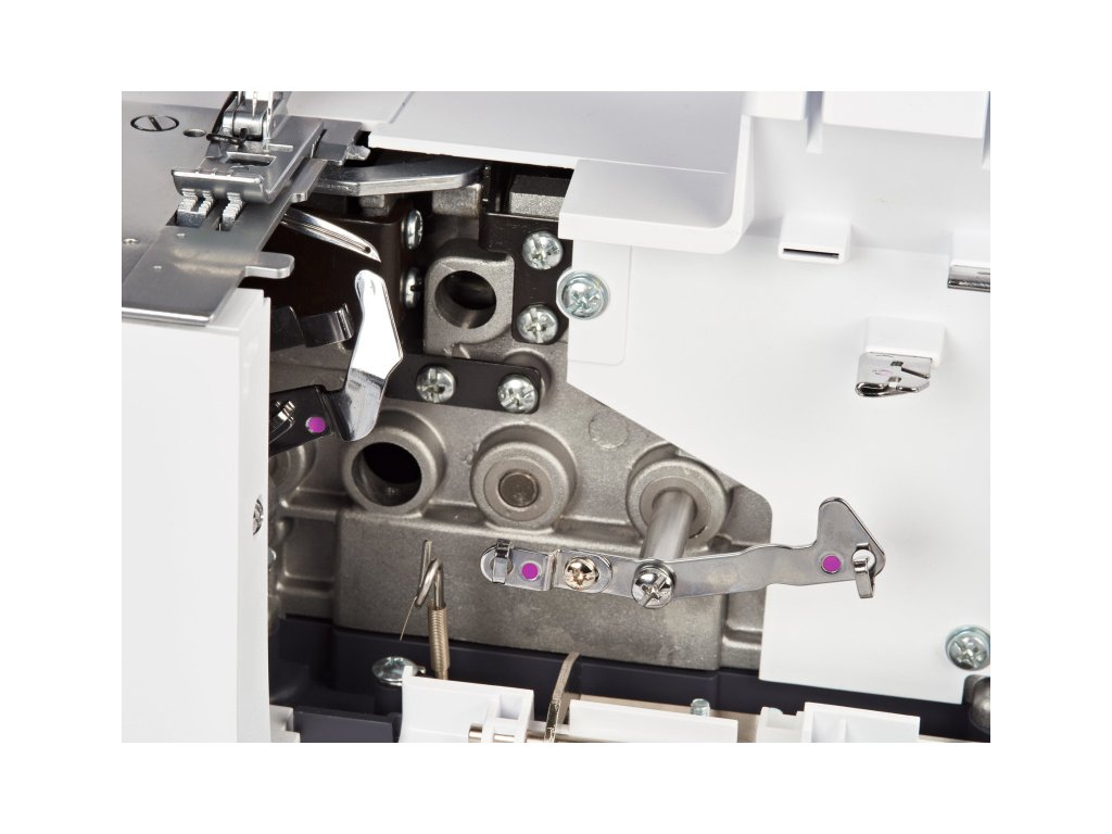 Příjemné LED osvětlení pro dobrou viditelnost, prostor pod ramenem stroje 87mm pro příjemnou práci. Rychlost šití 1300 stehů za minutu. Na stroji je integrována miska na odřezky, bezpečnostní pojistka - když je otevřený kryt, stroj nešije. Jednoduché turistické značení pro navlečení nití.