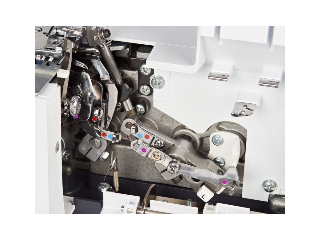 Příjemné LED osvětlení pro dobrou viditelnost, prostor pod ramenem stroje 87mm pro příjemnou práci. Rychlost šití 1300 stehů za minutu. Na stroji je integrována miska na odřezky, bezpečnostní pojistka - když je otevřený kryt, stroj nešije. Jednoduché turistické značení pro navlečení nití.